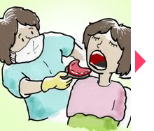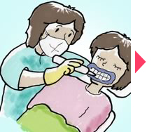 | お口の型を取り、薬剤を入れるトレーを作ります。 | トレーを持ち帰り薬剤を塗ります。 | 毎日5〜6時間以上装着します。 就寝中でもOK。 |