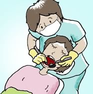 C【第一次手術】 用意した型を患者さんのお口にあて、歯ぐきを切開し、設計どおりにインプラントをあごの骨のなか埋入します。通常、局所麻酔で行います。インプラントを埋入し終わったら、歯ぐきを縫合してインプラントを被い、保護します。 |