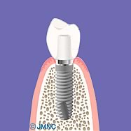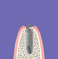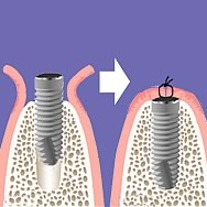E【第二次手術】 インプラントとあごの骨がしっかり結合したら、歯ぐきを再び切開し、埋入したインプラントの頭部を出してアバットメントを付けます。歯ぐきが治るまで1?3週間ほど待ちます。 |