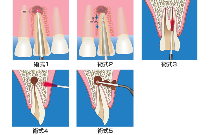 | 歯内療法において、半導体レーザーは弾性のあるファイバーで導光できるので他種レーザーより有利です。 根管内にレーザーを照射することにより、根管内細菌の減少、排膿・出血の消失、打診などの症状の軽減なども期待できます。 また、組織透過型の半導体レーザーは、根管および歯周組織を通過したレーザー光が根尖部歯周組織に到達することにより、口内炎に対する照射と同様、組織の治癒促進効果も期待できます。 |