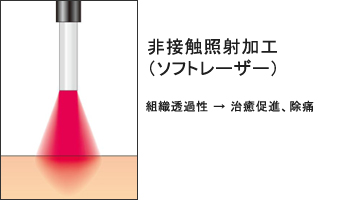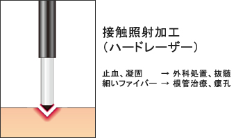 | 半導体レーザーは、接触照射(ハードレーザー用)、非接触照射(ソフトレーザー用)の2通りの使用ができます。その特徴を活かして、ほかのレーザー機器より広い範囲の症例に使用することができます。 | |