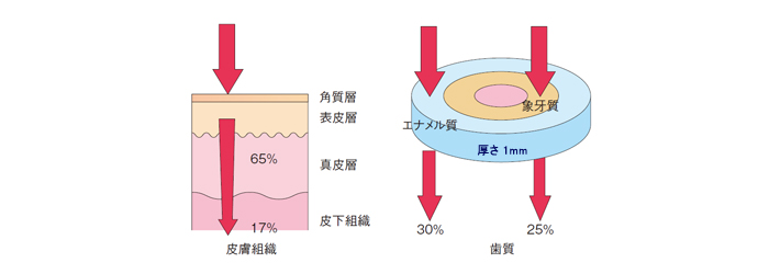 | 半導体レーザーは、皮膚組織において皮下組織にまで透過する量は17%とされ、エナメル質、象牙質(厚さ1mm)に対し、それぞれ、30%、25%が透過するとされます。この組織透過性を利用し、象牙質知覚過敏症や感染根管処置に有効に作用します。 |