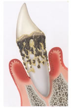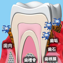 【歯周病】 歯垢(プラーク)の中の歯周病菌が、歯ぐき(歯肉)に炎症をおこしたり、歯根膜や歯槽骨を溶かしてしまう病気。 歯垢は歯の表面につく白いネバネバした物質で、この中に細菌がすみついている。 手抜き歯みがきや不規則な食生活などが歯垢の増える原因に。 |