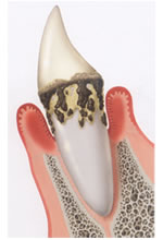 【3期 中等度歯周炎】 歯周ポケット=5〜7mm 炎症が奥まで進み、歯ぐきはブヨブヨした状態になり、血や膿が出て、口臭もひどくなる。歯槽骨がかなり溶けて、歯がぐらついてくる。 ブラッシング、マッサージ、歯石の除去(SRP※)と、必要に応じて歯周外科手術を行う。 |